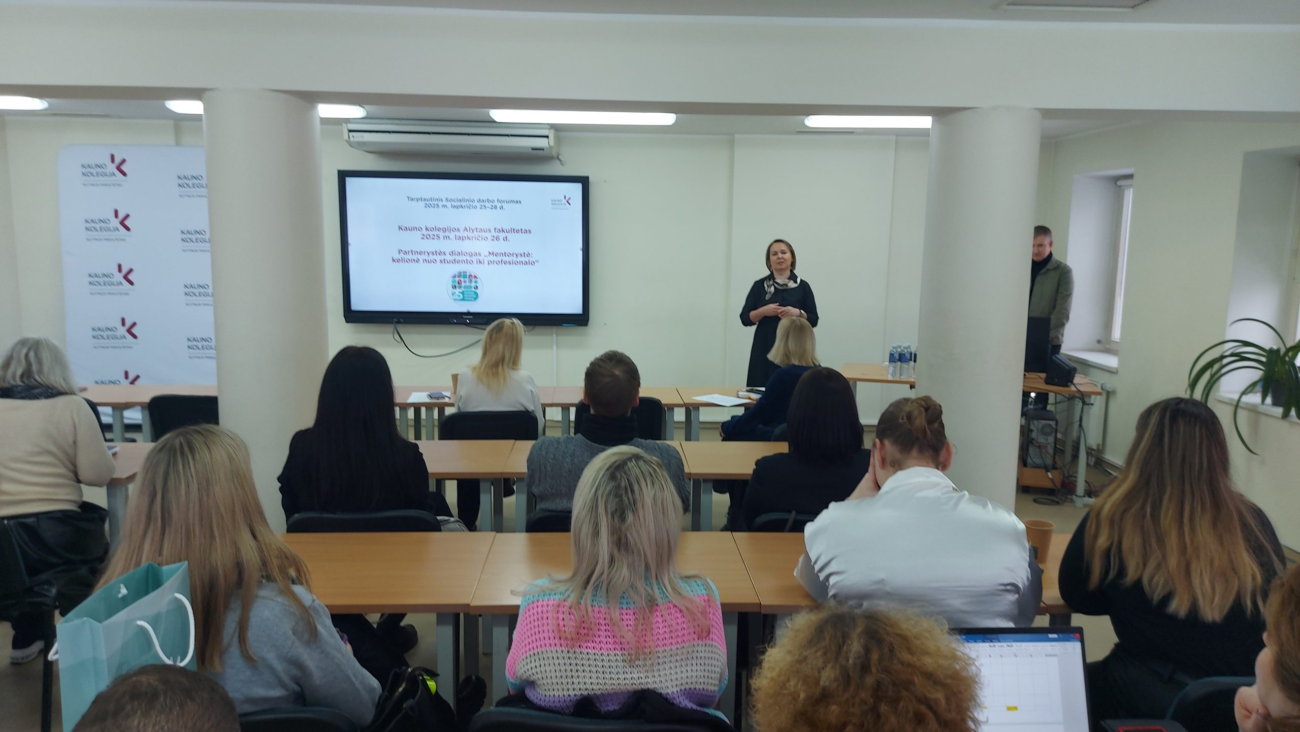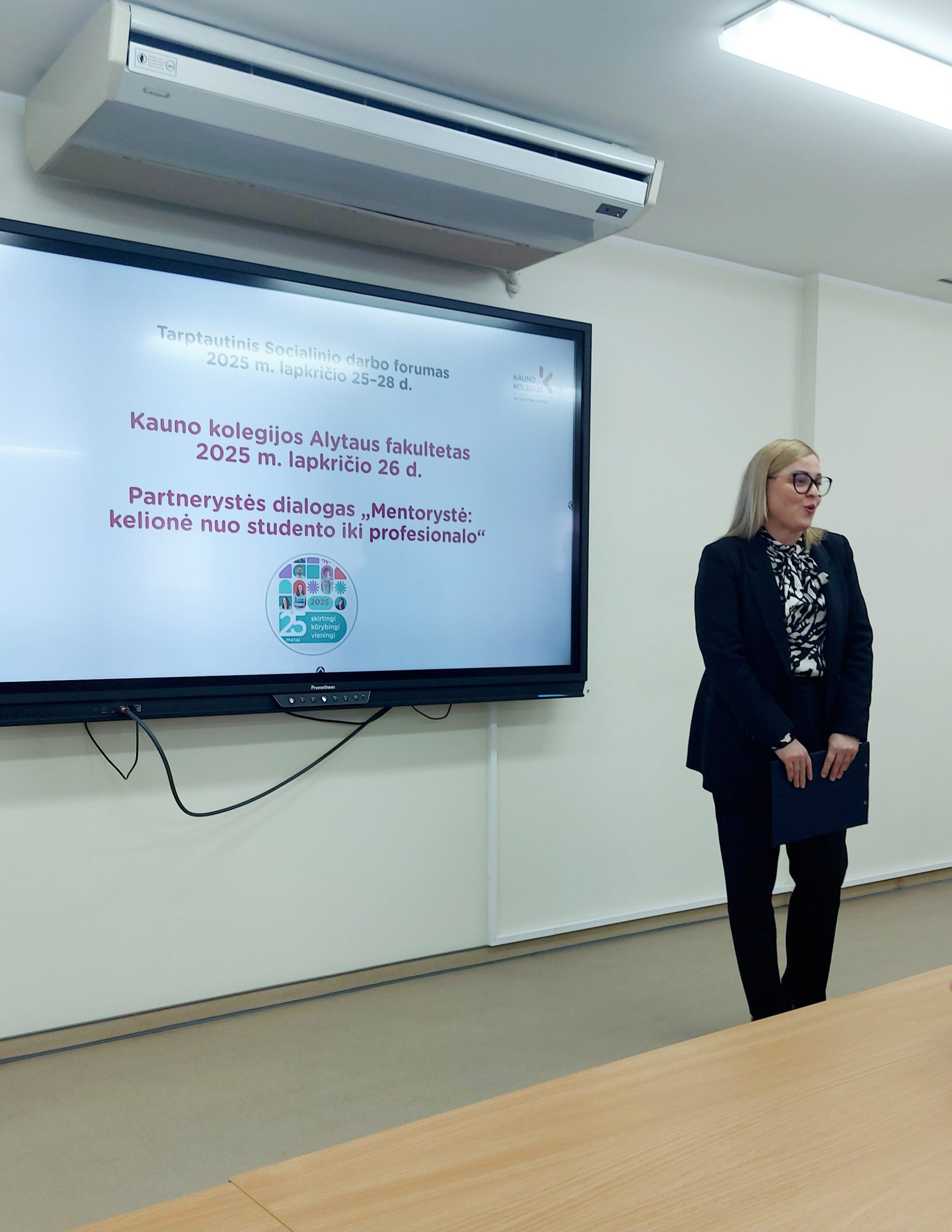 Toliau sekė Vaidos Čyžiūtės-Tatulienės, Alytaus miesto socialinių paslaugų centro direktoriaus pavaduotojos socialiniam darbui ir LSDA Alytaus skyriaus kuratorės, pranešimas „Nuo praktikos iki profesijos: mentorystės patirtys Alytaus miesto socialinių paslaugų centre“. Ji aptarė, kaip institucijoje kuriama studentų praktikos aplinka, kaip organizuojama mentorystė ir kokią realią naudą ji suteikia tiek studentams, tiek organizacijoms.