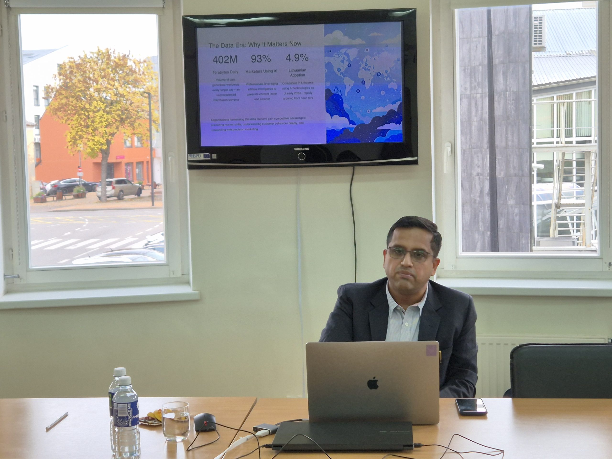 Diskusijos metu dr. Sharma pristatė pagrindinius principus, kaip šiuolaikiniai technologiniai sprendimai – dirbtinis intelektas ir duomenų analizės įrankiai – gali būti ir yra sėkmingai integruojami į verslo strategijas, siekiant ne tik efektyvumo, bet ir ilgalaikio tvarumo bei pabrėže, kad būtent šių įrankių taikymas leidžia įmonėms greičiau reaguoti į rinkos pokyčius, geriau pažinti vartotojų elgseną, optimizuoti išteklius bei kurti atsakingas, socialiai ir aplinkai palankias komunikacijos kampanijas.