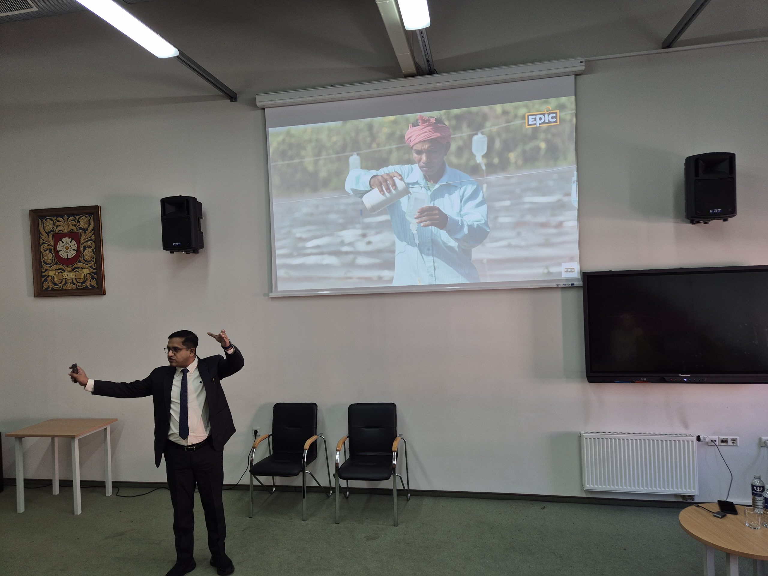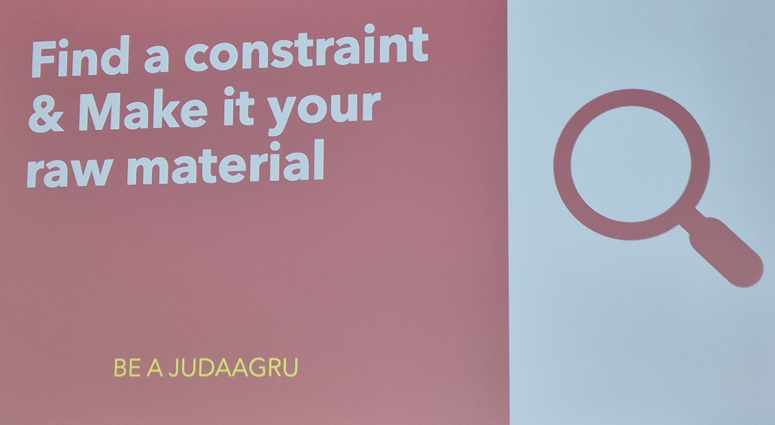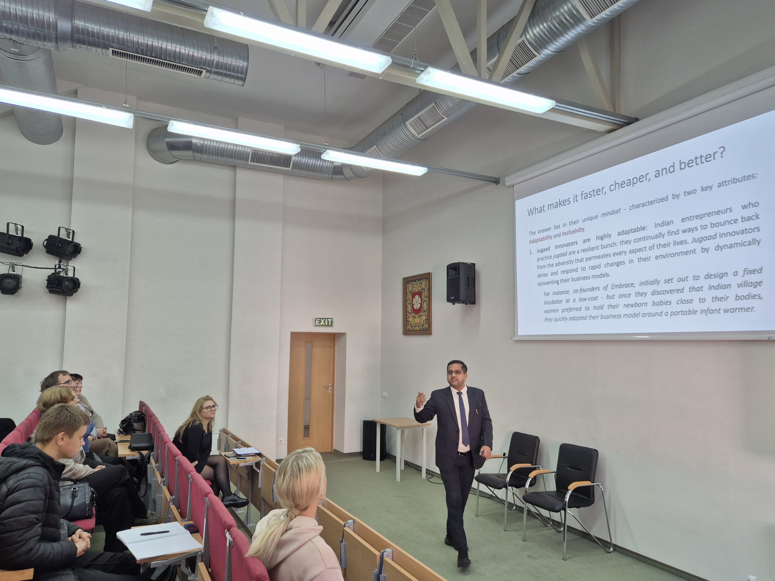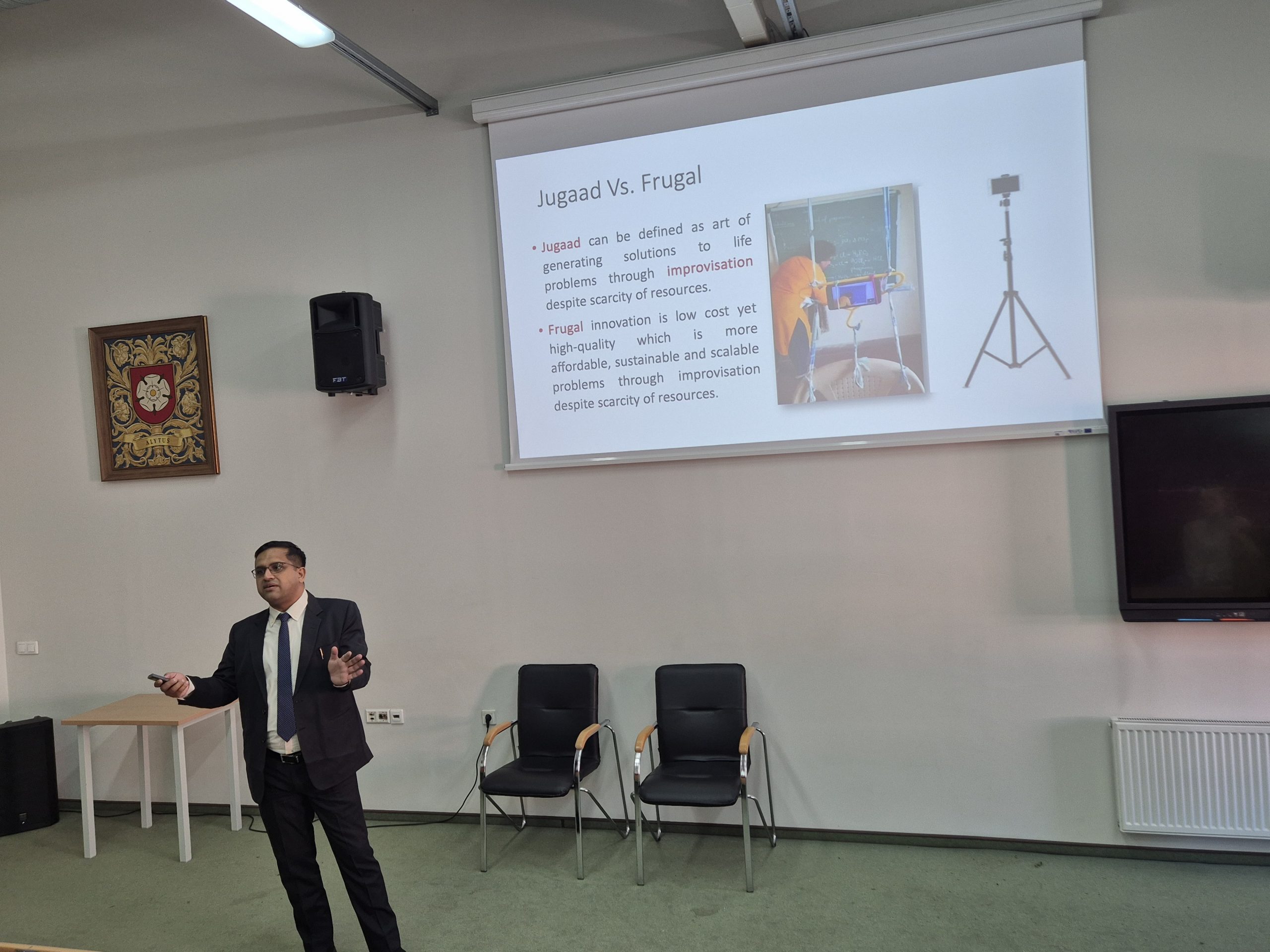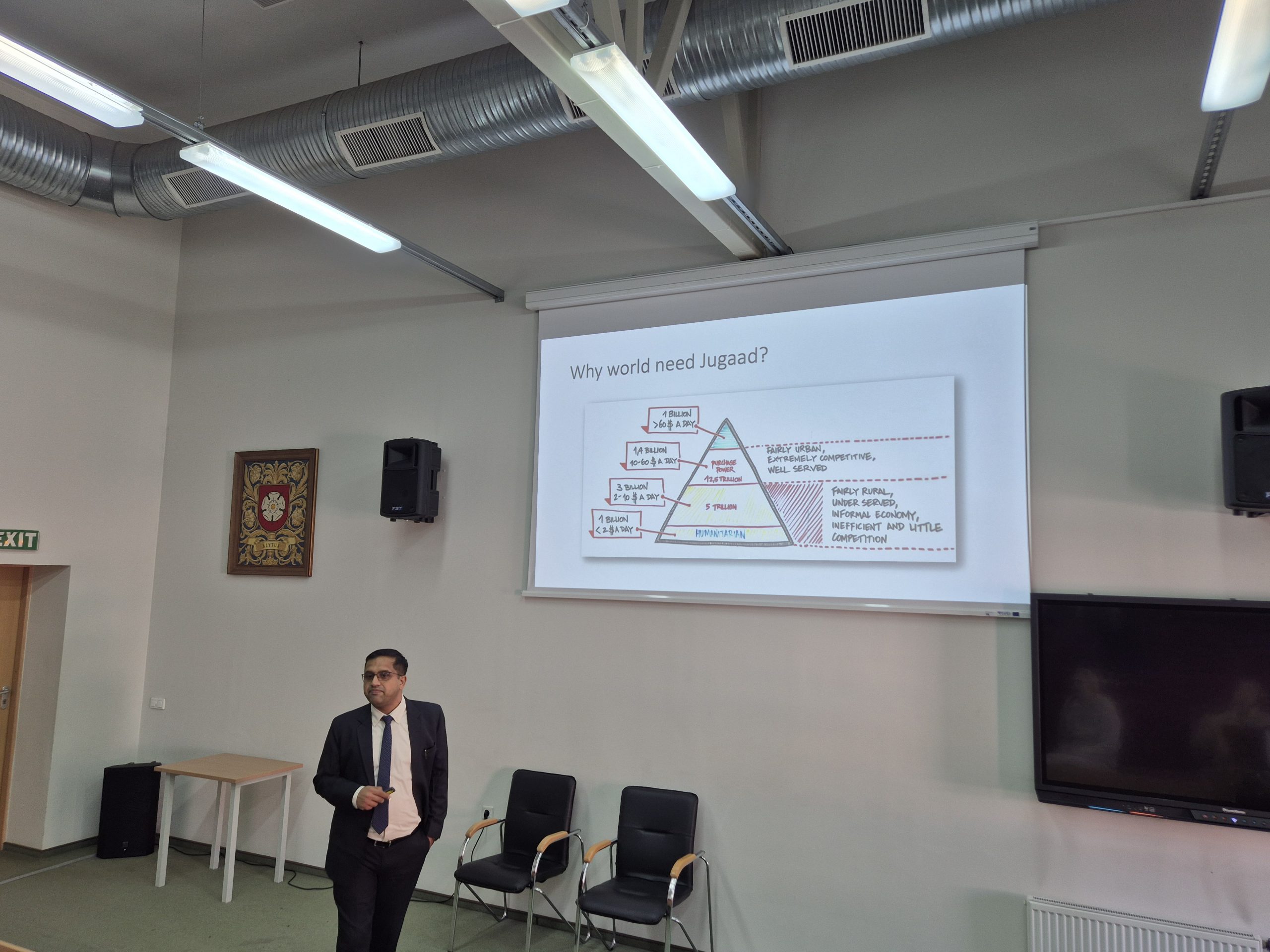 „Jugaad“– tai Indijoje paplitusi kūrybinio mąstymo filosofija, paremta gebėjimu kūrybiškai ir efektyviai spręsti problemas, remiantis turimais ribotais resursais. Paskaitos metu Dr. Sharma pabrėžė, kad „Jugaad“ nėra vien konkretus produktas, o nuolatinis procesas, kuriame susipina taupumas, lankstumas ir įtrauktis, bei teigė, kad iššūkiai ir trūkumas nėra vien kliūtys, bet kūrybiškumo ir inovacijų šaltiniai, todėl svarbu aktyviai ieškoti ir drąsiai priimti kiekvieną ribotumą kaip galimybę ir žaliavą inovatyviems sprendimams, ne retai virstantiems sėkmingo verslo pradžia. Tęsdamas, Dr. Sharma pateikė daug praktinių pavyzdžių, kaip ši filosofija įgyvendinama įvairiose srityse – nuo technologinių sprendimų kaimo bendruomenėse, pavyzdžiui, molinio šaldytuvo (mitticool refrigerator) ar pritaikytų gliukozės infuzijos buteliukų irigacijos sistemai žemės ūkyje, iki inovatyvių verslo modelių, leidžiančių startuoliams ir stambioms įmonėms pasiekti konkurencinį pranašumą.