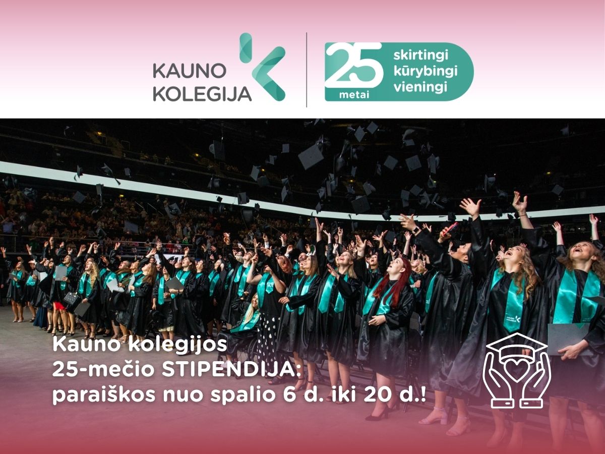 Minėdama 25-uosius veiklos metus, Kauno kolegija įsteigia šventinę 25-mečio stipendiją, skirtą aktyviausiems kolegijos studentams. Kviečiame II–IV kursų studentus, aktyviai dalyvaujančius mokslo ir (ar) meno taikomojoje bei projektinėse veiklose, atstovaujančius Kauno kolegijai konkursuose ir sporto varžybose, įsitraukiančius į savanoriškas ir mentorystės veiklas, nuo spalio 6 d. iki spalio 20 d. teikti paraiškas Kauno kolegijos 25-mečio stipendijoms gauti.