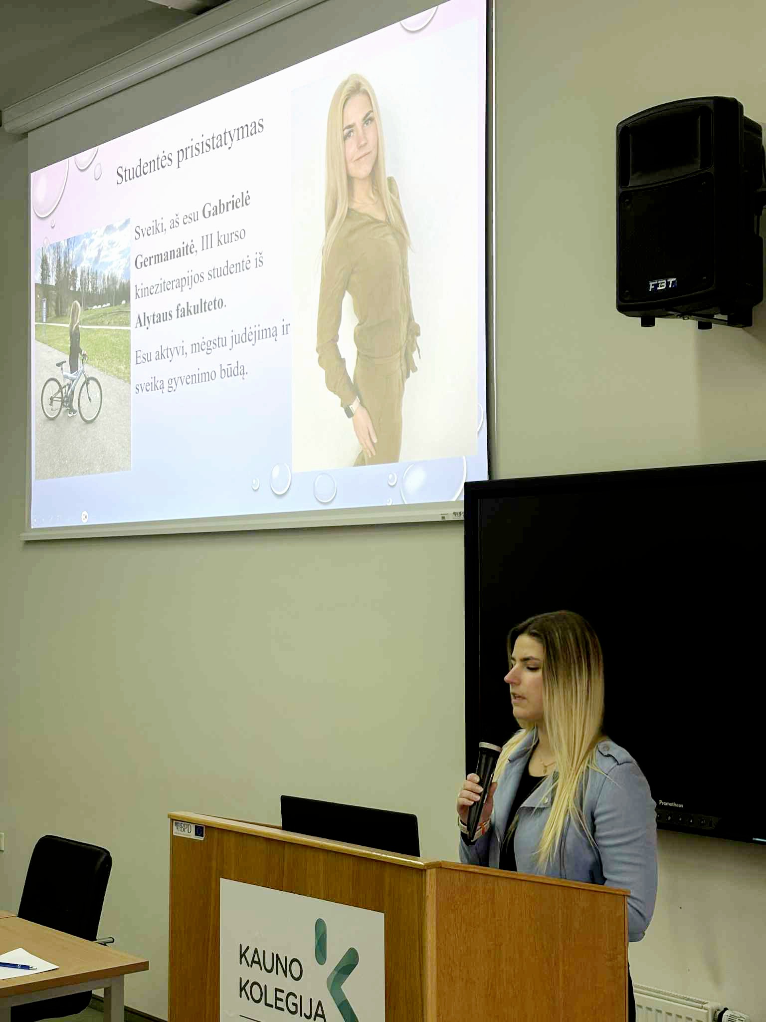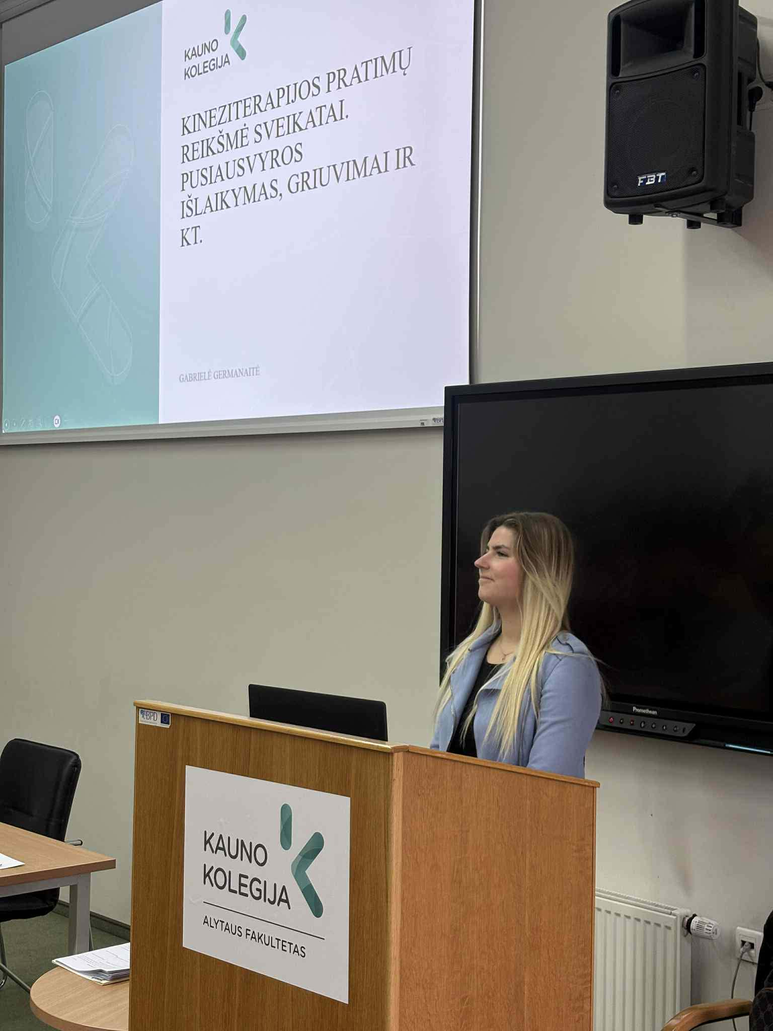 Sausio 23 d. Kauno kolegijos Alytaus fakultete vyko Trečiojo amžiaus universiteto (TAU) susitikimas, kurio metu Kineziterapijos studijų studentė Gabrielė Germanaitė skaitė pranešimą „Ar viską žinome apie kineziterapijos pratimų reikšmę sveikatai?“. Renginio metu daug dėmesio skirta griuvimų prevencijai, fizinio aktyvumo svarbai ir gyvenimo kokybės gerinimui vyresniame amžiuje.
