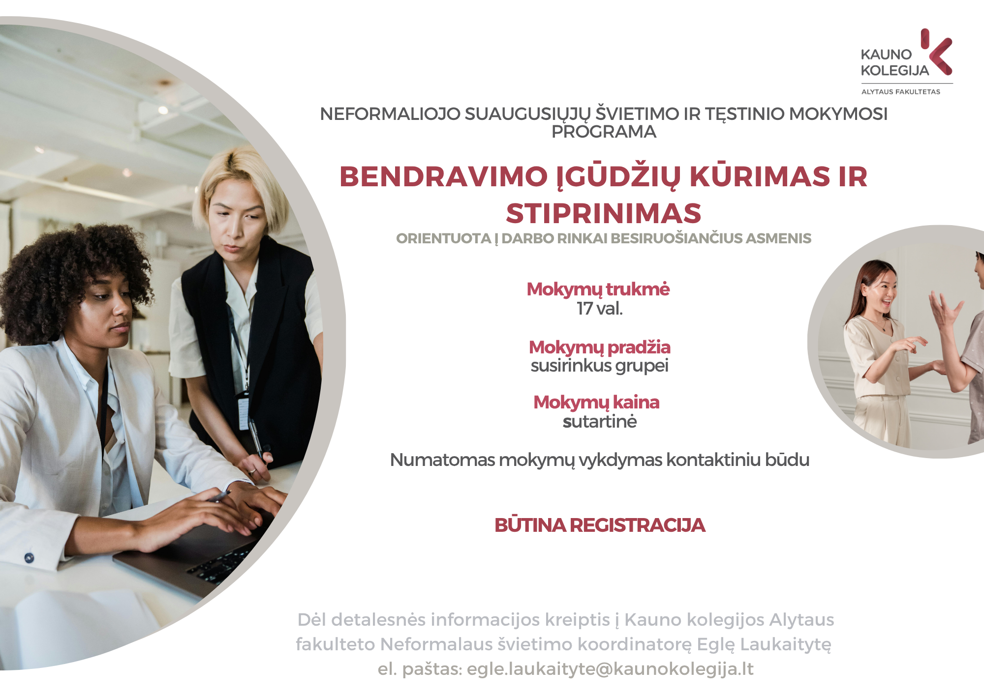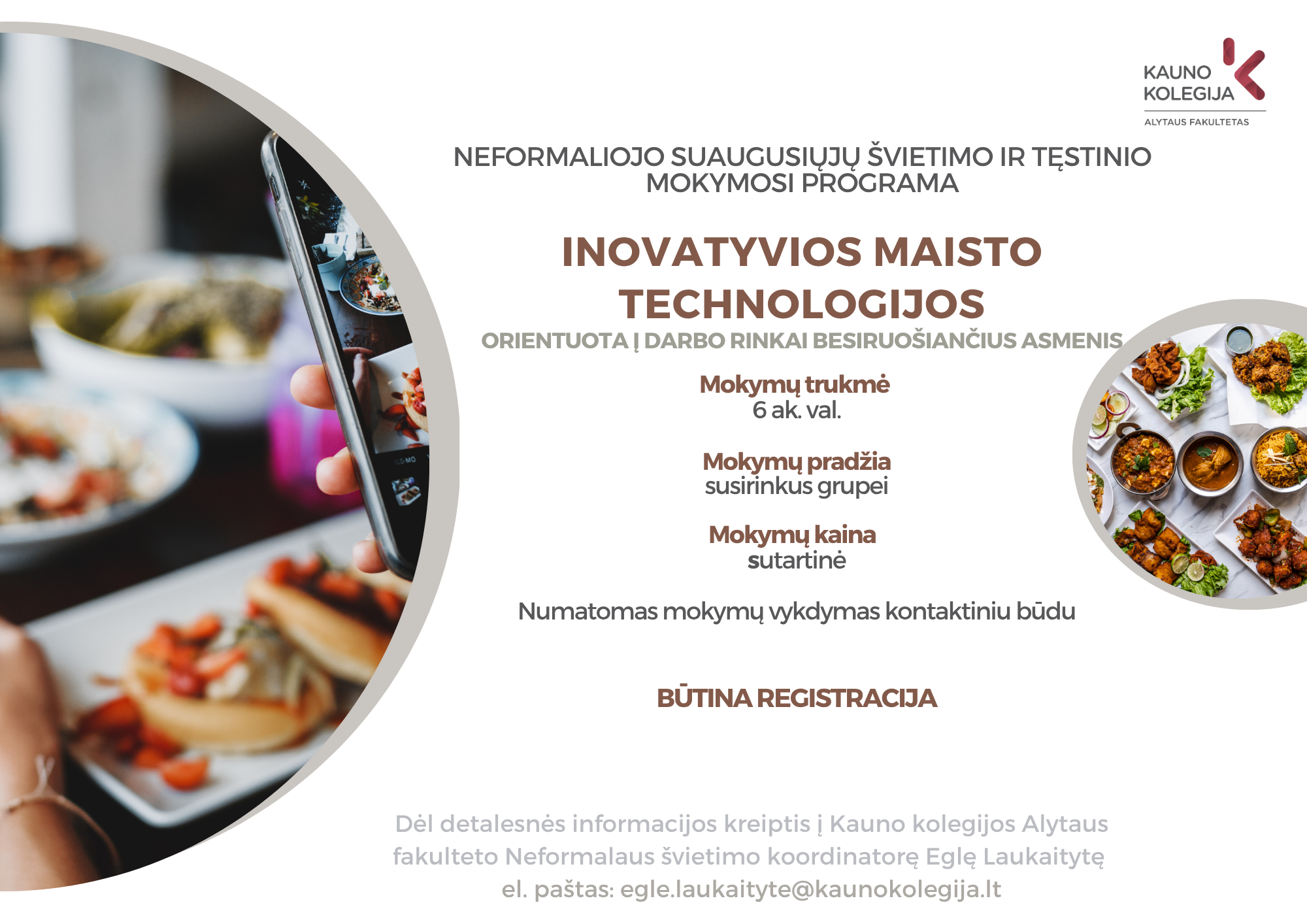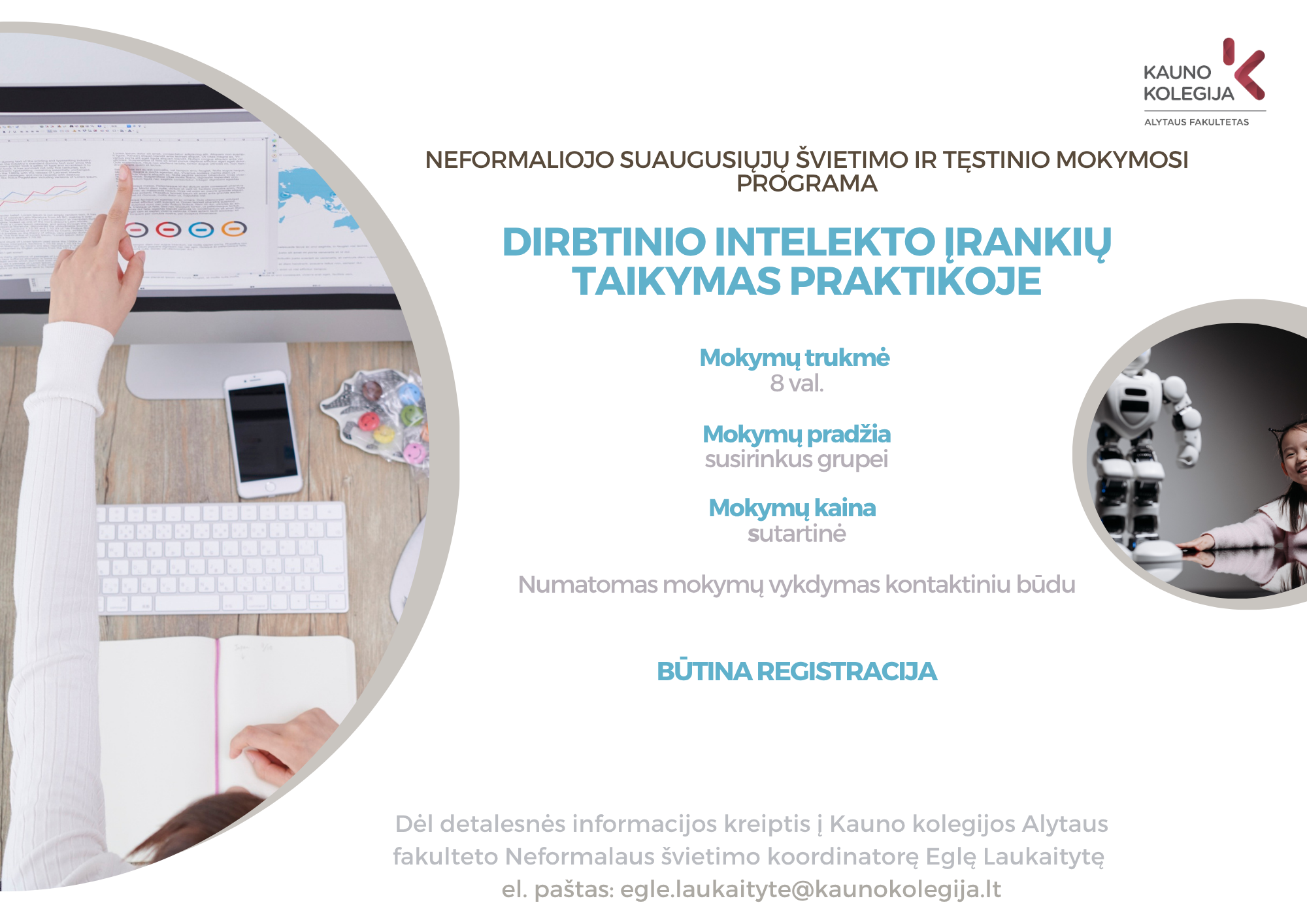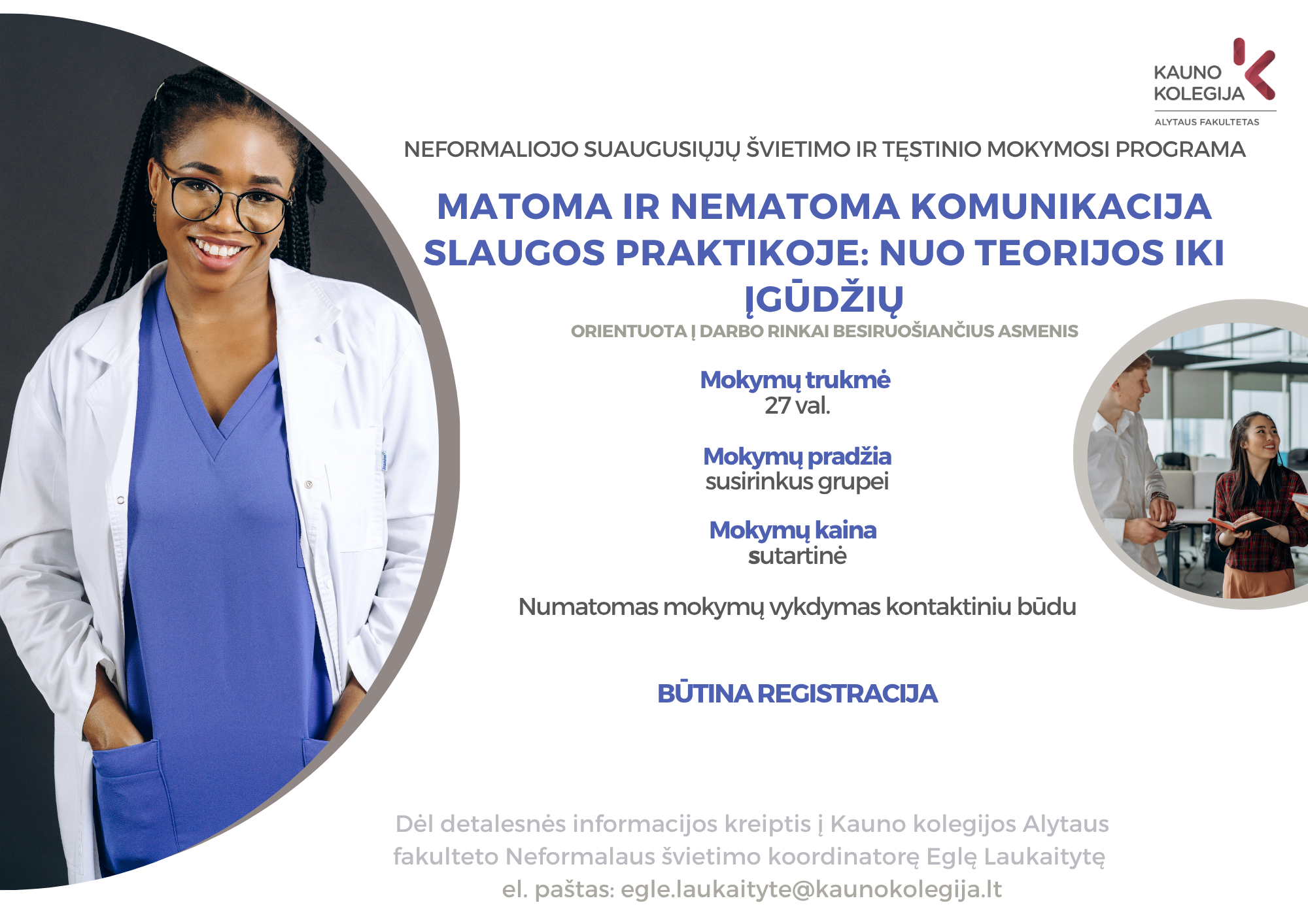 Kontaktinė informacija: Neformalaus švietimo koordinatorė Eglė Laukaitytė Tel.: +370 683 88 706 El. paštas: egle.laukaityte@kaunokolegija.lt