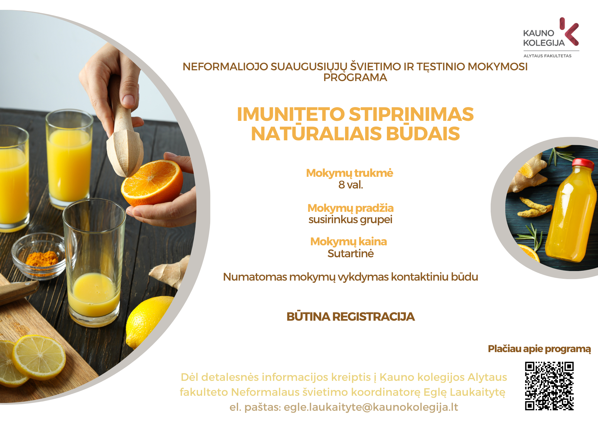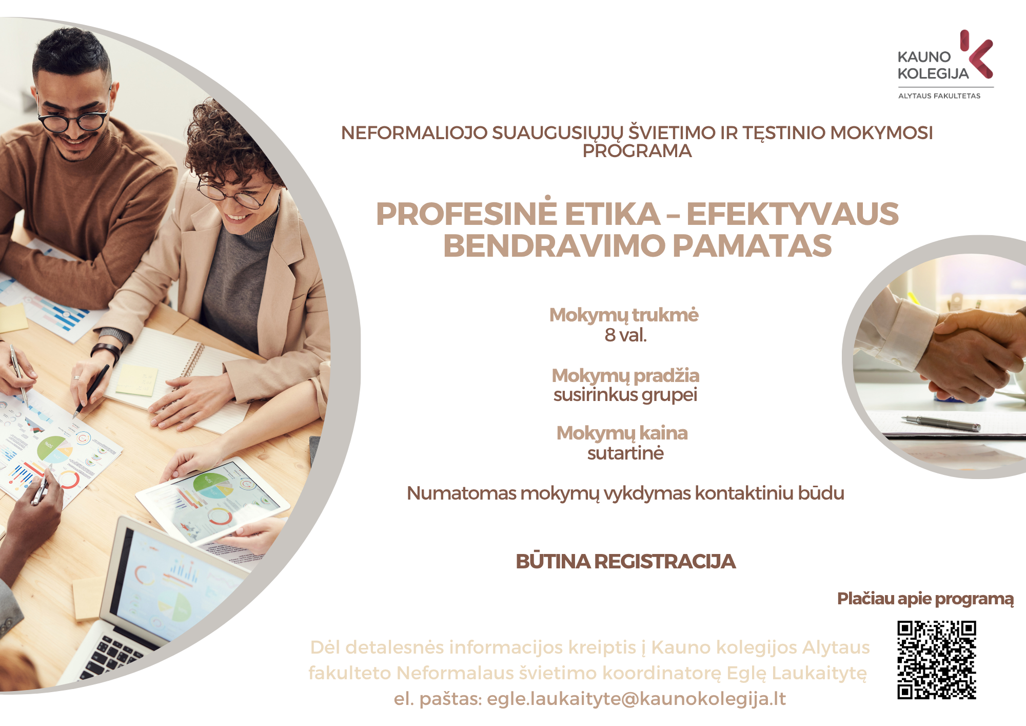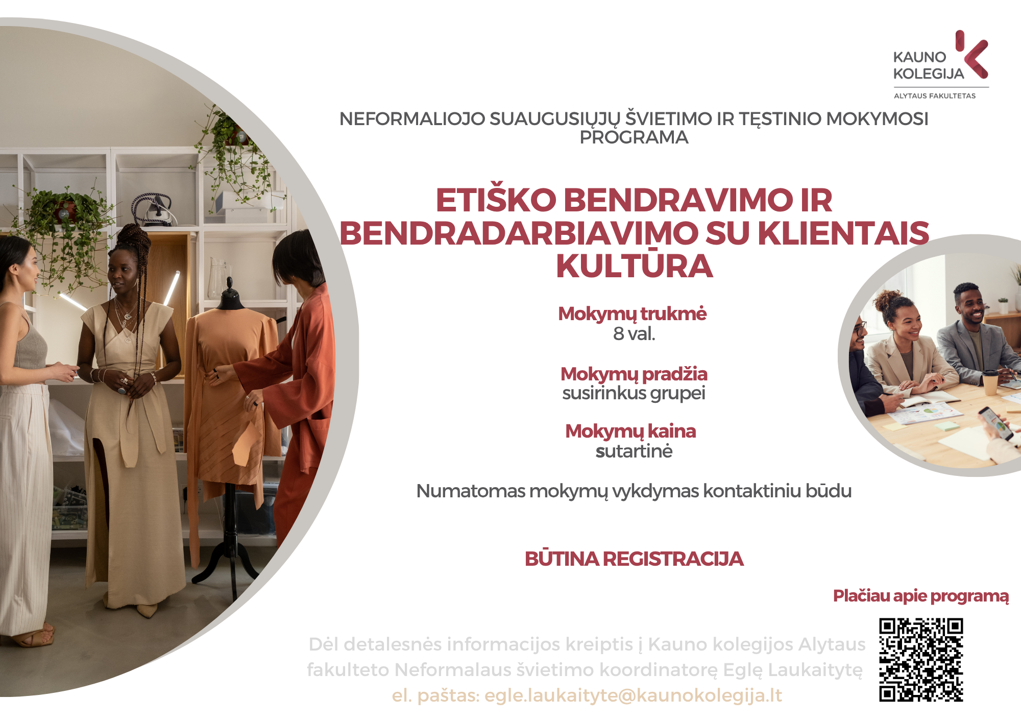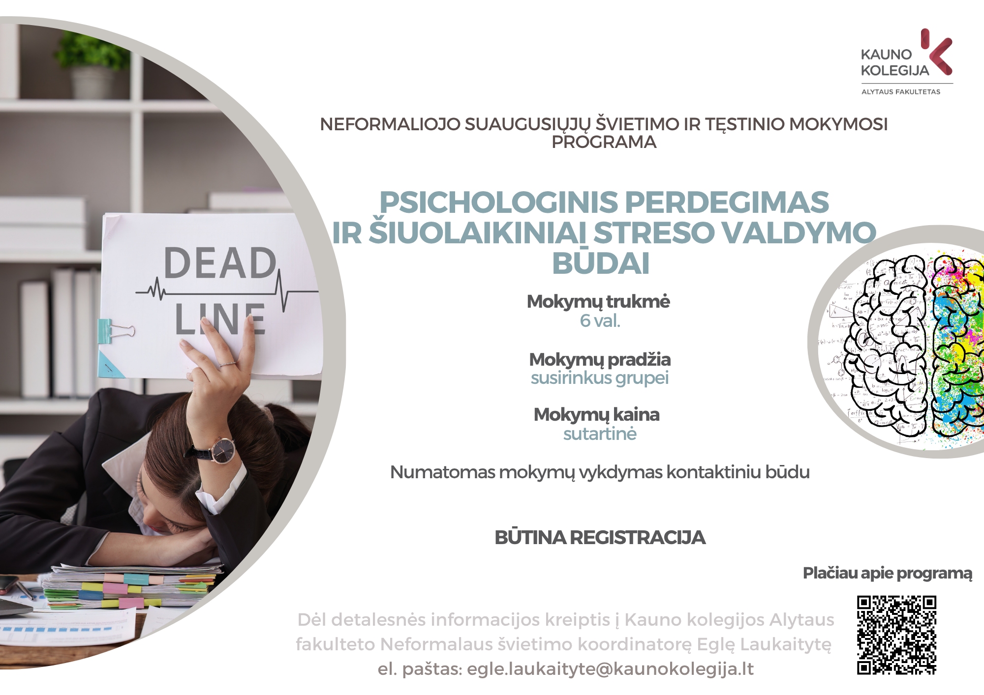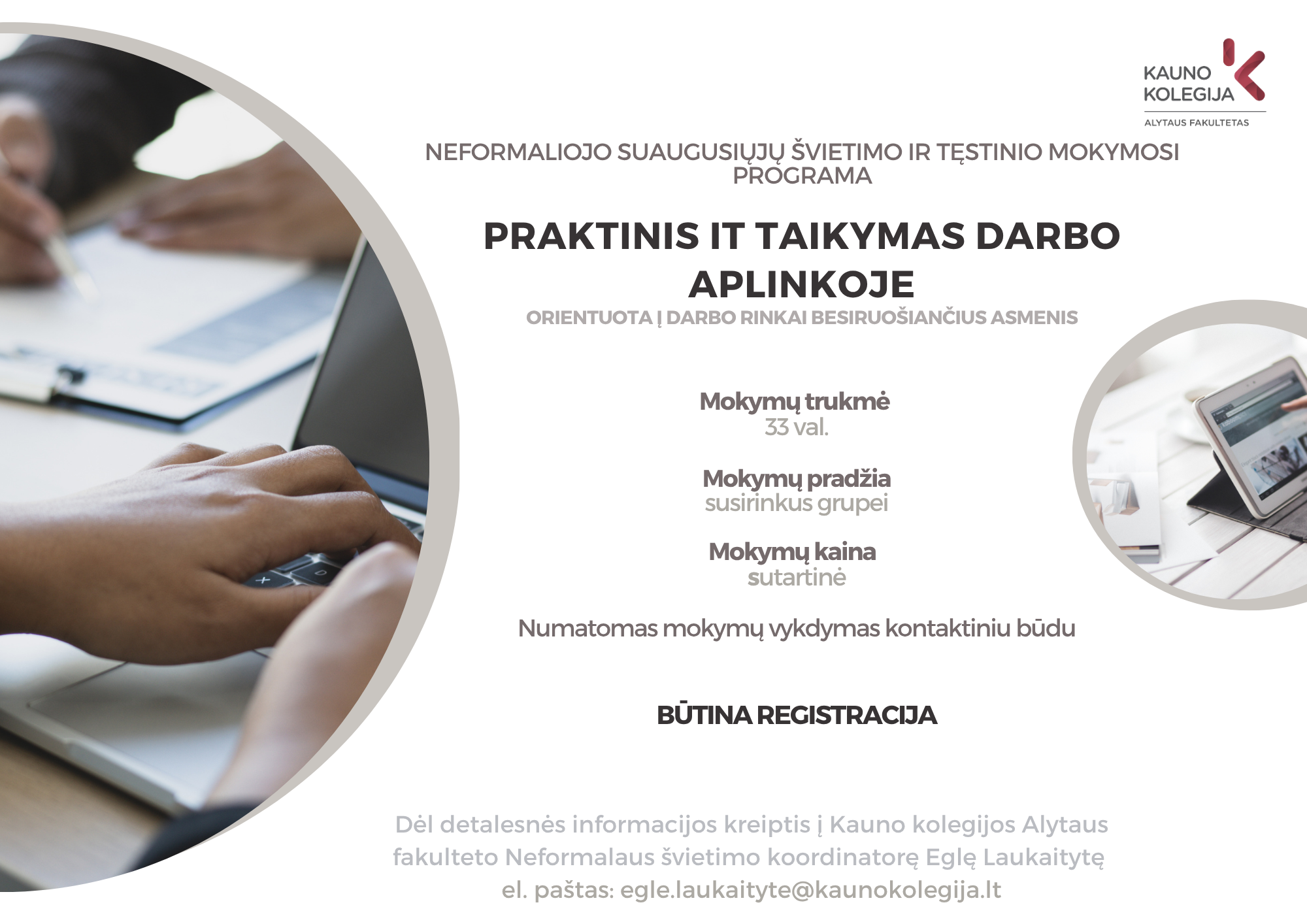 Kontaktinė informacija: Neformalaus švietimo koordinatorė Eglė Laukaitytė Tel.: +370 683 88 706 El. paštas: egle.laukaityte@kaunokolegija.lt