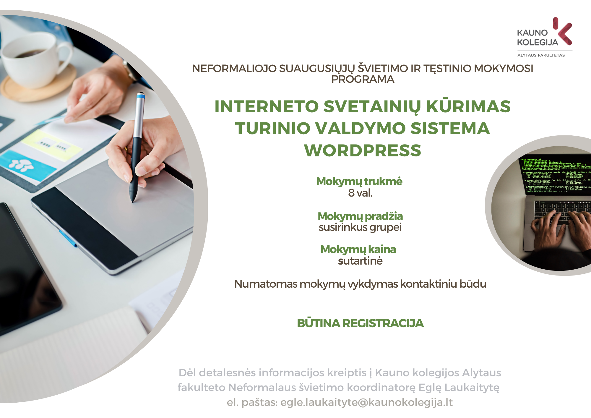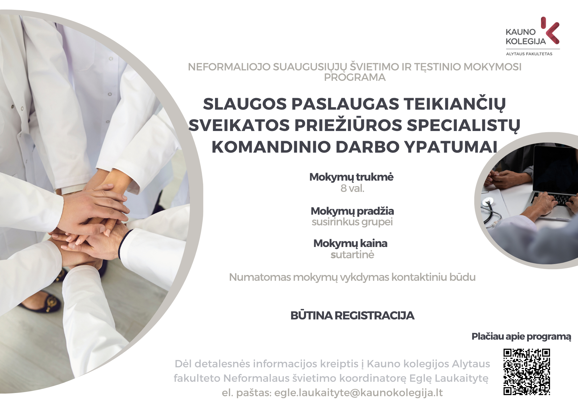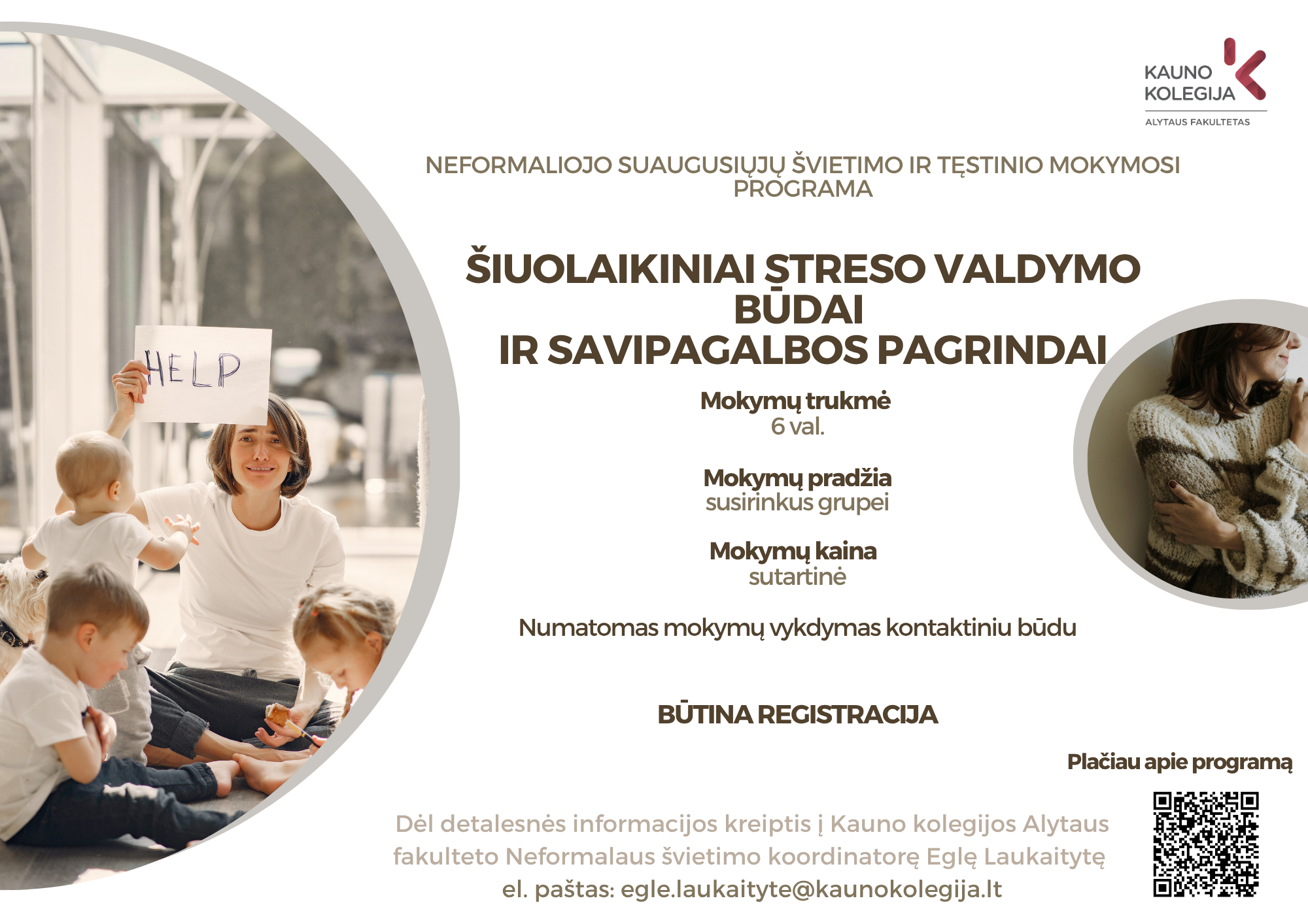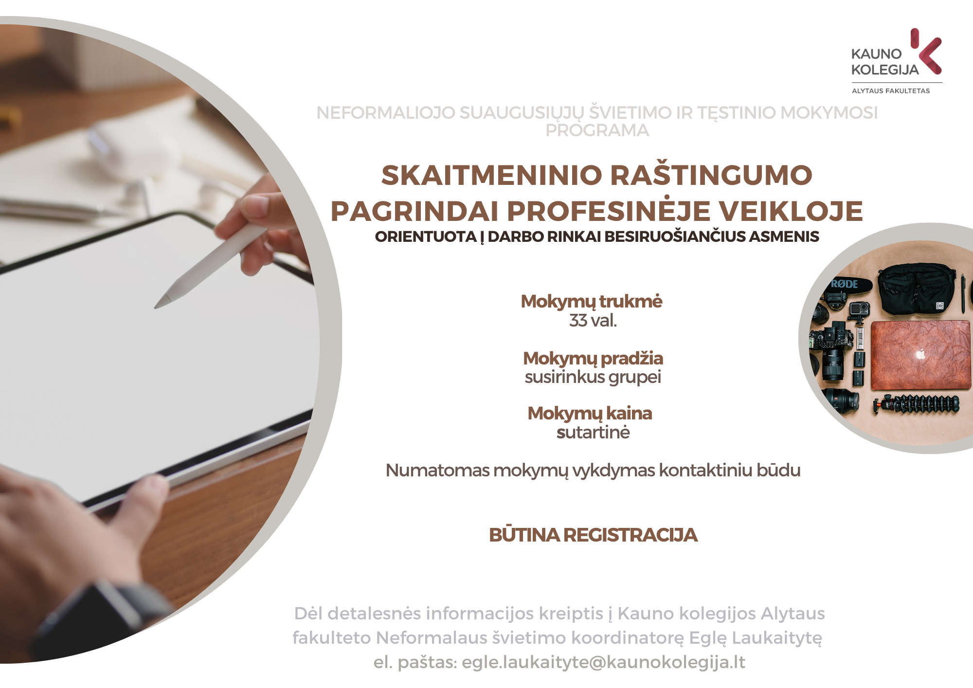 Kontaktinė informacija: Neformalaus švietimo koordinatorė Eglė Laukaitytė Tel.: +370 683 88 706 El. paštas: egle.laukaityte@kaunokolegija.lt