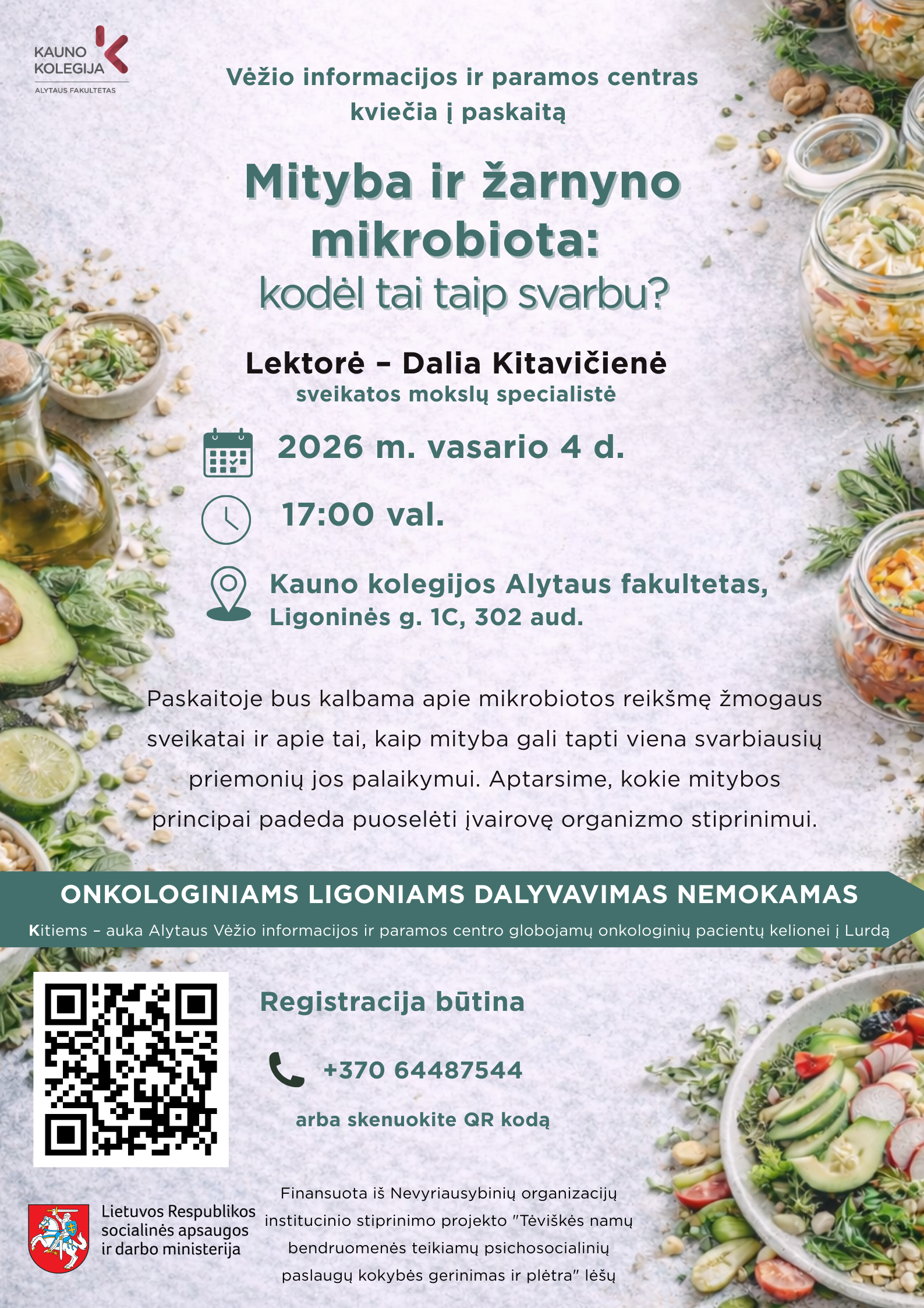 Kauno kolegijos Alytaus fakultetas kartu su Vėžio informacijos ir paramos centru kviečia į atvirą paskaitą „Mityba ir žarnyno mikrobiota: kodėl tai taip svarbu?“, skirtą visiems, besidomintiems sveikata, mitybos įtaka organizmui bei bendruomeninėmis iniciatyvomis, padedančiomis onkologiniams pacientams.