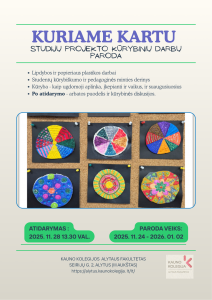 Kauno kolegijos Alytaus fakultetas kartu su Menų ir ugdymo fakulteto Pedagogikos katedra nuoširdžiai kviečia Jus į studentų projektinės veiklos „Ugdomosios aplinkos kūrimas/tobulinimas kūrybiniais darbais ikimokyklinio ugdymo įstaigoje“ kūrybinių darbų parodos „KURIAME KARTU!“ atidarymą, kuris vyks: