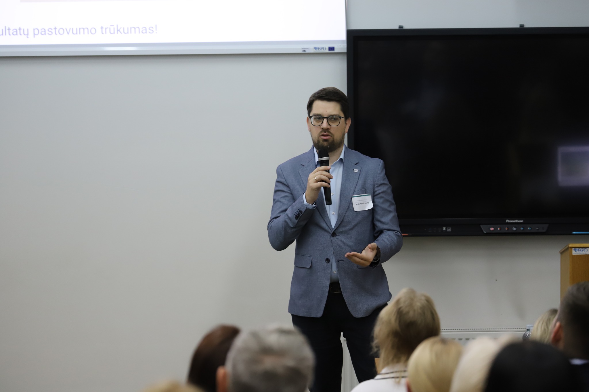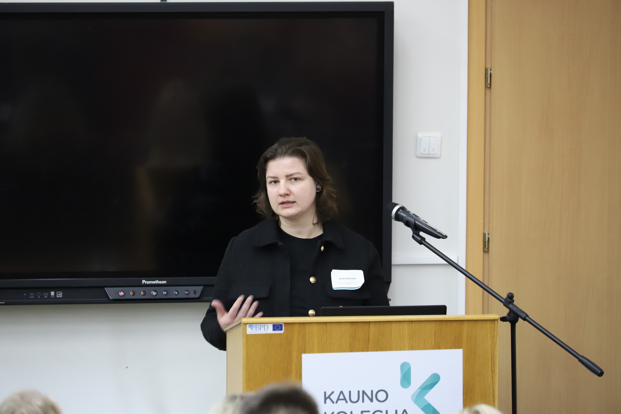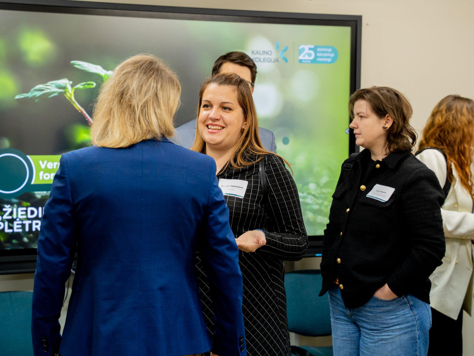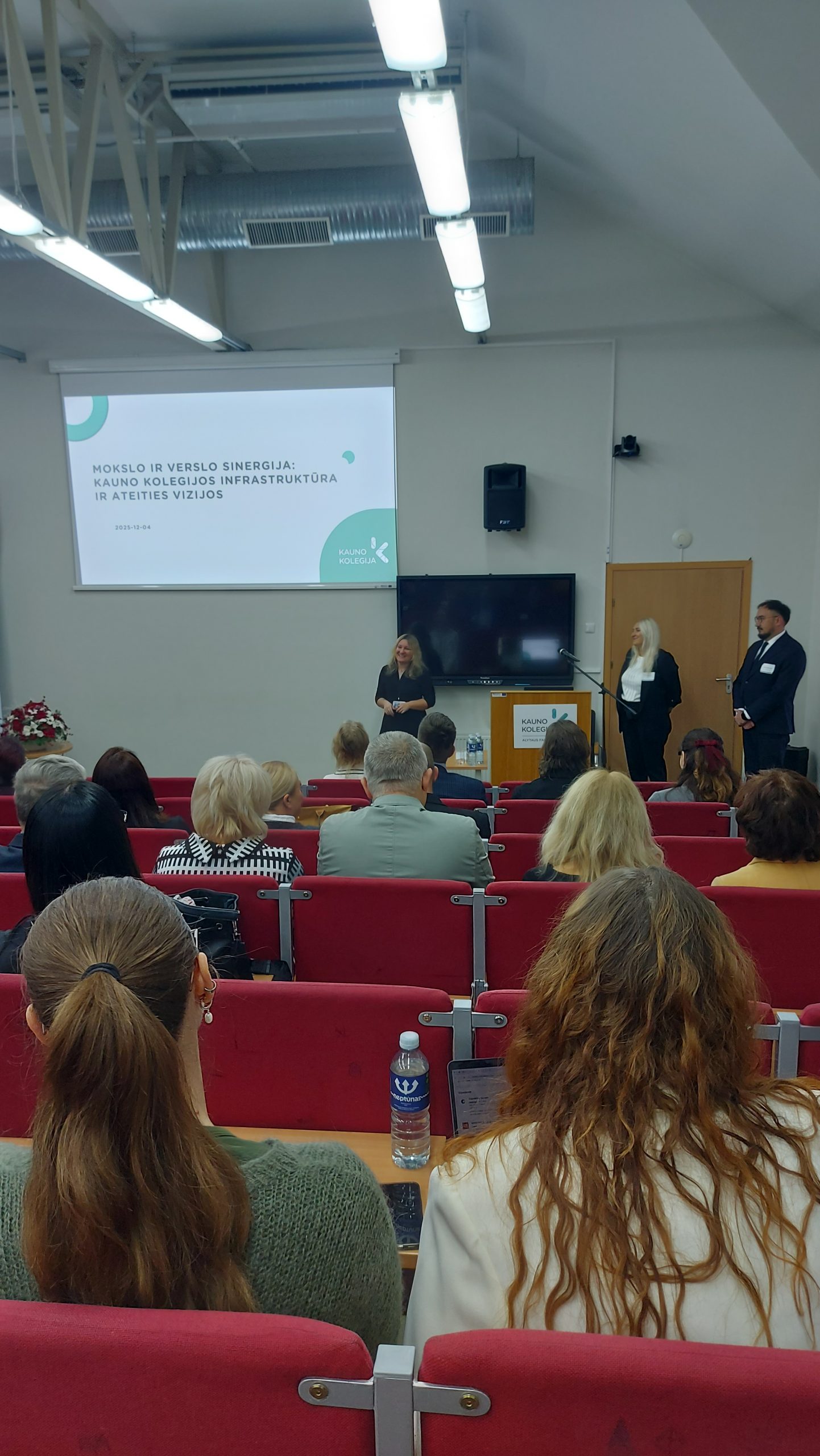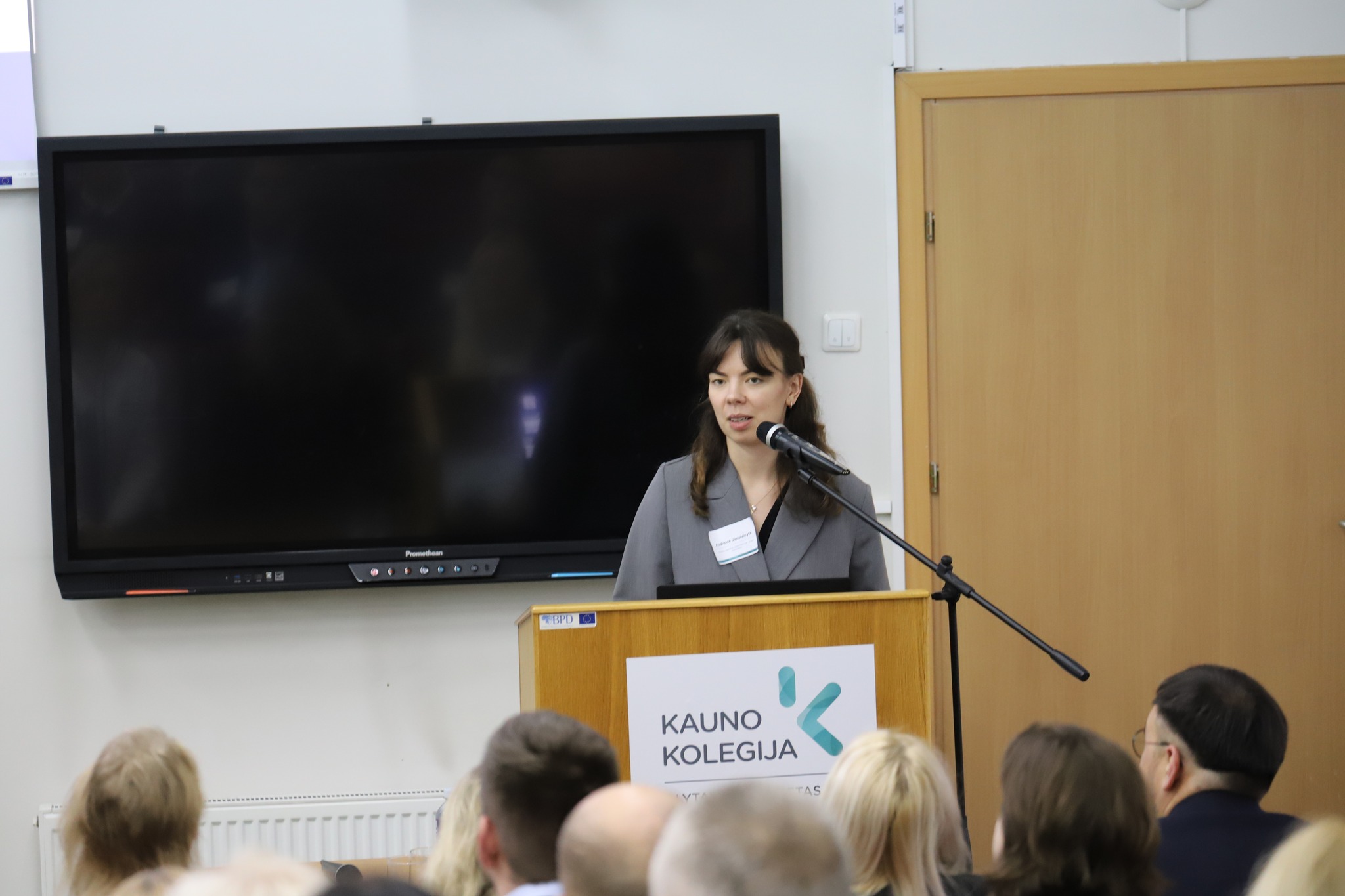 Kauno kolegijos atstovai – Projektų skyriaus vadovė Lina Kuraitienė, Mokslo taikomosios veiklos skyriaus mokslo kokybės koordinatorė dr. Kristina Grumadaitė ir Informatikos, inžinerijos ir technologijų fakulteto dekanas dr. Tomas Makaveckas – pristatė šiuo metu plėtojamas tyrimų kryptis, projektines veiklas, laboratorijų infrastruktūrą ir planuojamus centrus, kurie taps platforma aktyviam bendradarbiavimui su verslu.